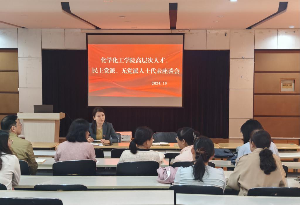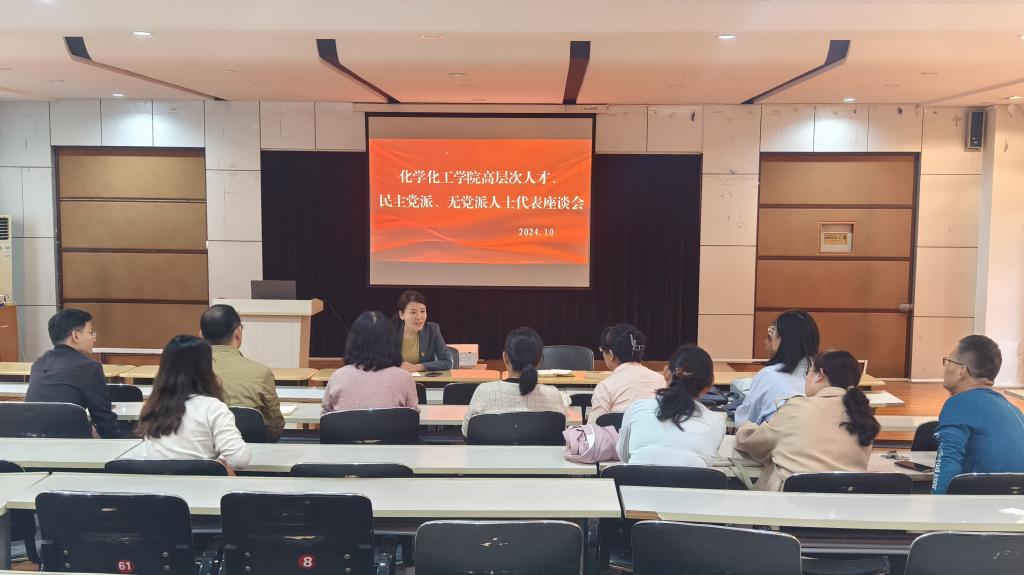 为贯彻落实习近平总书记关于做好新时代党的统一战线工作的重要思想,凝聚发展共识,鼓励高层次人才、各民主党派和无党派人士为学院改革发展建言献策,10月22日,化学化工学院于求实楼215会议室召开高层次人才、各民主党派和无党派人士代表座谈会。学院高层次人才教师代表、各民主党派和无党派人士代表参会。会议由学院党委书记主持。