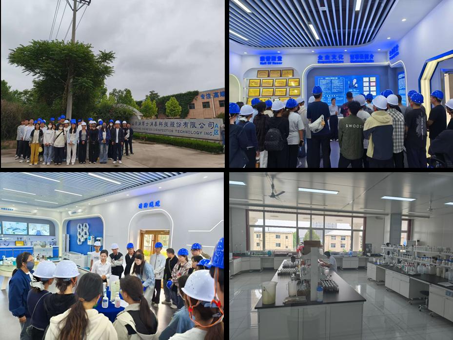 在山东消博士消毒科技股份有限公司王蕊经理的带领下,学生们首先参观了公司展厅,王经理深入讲解了消毒行业的发展历程及未来趋势,并详细介绍了公司的发展历史和核心产品——消毒剂及其应用。这一环节帮助学生们建立了对消毒行业及其关键材料的宏观认知。随后,学生们参观了部分研发车间,了解了消毒剂的研发过程及技术创新。在此过程中,学生们不仅掌握了消毒剂的相关知识,还深入理解了研发流程及行业发展方向。