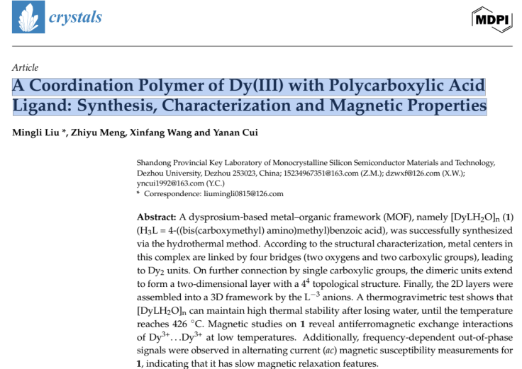 近日,我校化学化工学院教师刘明丽副教授作为第一作者,以德州学院为第一完成单位在SCI期刊《Crystals》(中科院三区)发表题为“A Coordination Polymer of Dy(III) with Polycarboxylic Acid Ligand: Synthesis, Characterization and Magnetic Properties”的学术成果。