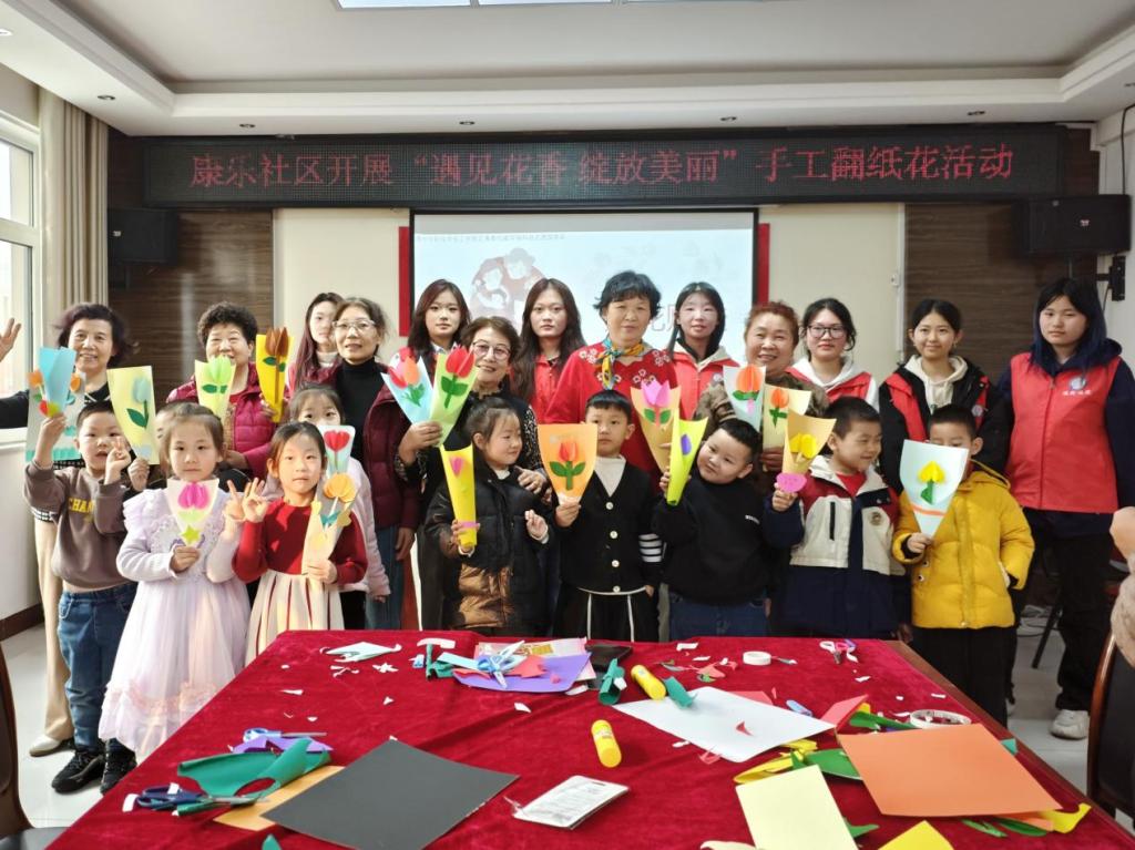 活动现场,社区志愿者通过文化讲解与手工实践相结合的形式,向社区居民及小朋友讲述了妇女节的历史意义及对女性社会贡献的尊重,引导人们理解节日背后的深刻内涵,感悟女性在家庭与社会中的无私付出。随后,社区居民与小朋友们在志愿者的示范指导下,从折叠纸张到创意剪裁,共同完成了一束束色彩缤纷的花束。孩子们将亲手制作的花束赠送给母亲、长辈及社区女性工作者,用稚嫩的语言表达“感谢您的付出”,现场洋溢着温暖与感动。
