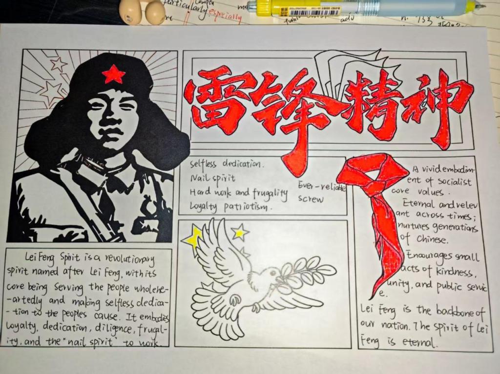 活动开展期间,同学们始终紧扣雷锋精神的核心内涵进行创作。大家满怀热忱、态度严谨地对英文文案反复推敲打磨,力求每个单词都能精准展现雷锋精神的独特魅力。在设计画报版面时,同学们独具匠心,从整体布局到细节装饰都深思熟虑,将雷锋的一个个感人故事娓娓道来。同学们将真挚的情感和生动的语言,融入对青春的独特理解与深刻感悟,注重作品思想性与艺术性的平衡与融合。