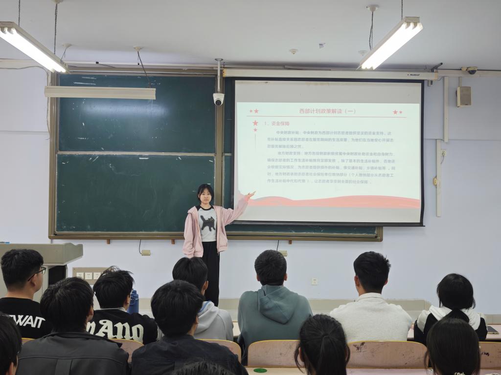 活动中,主讲人带领团员深入学习大学生志愿服务西部计划相关政策,系统介绍了该计划在教育、卫生、基层治理等领域的服务内容与岗位设置,并说明了服务期满后在升学、就业等方面的优惠政策。主讲人从国家战略与青年成长相结合的角度,阐释了西部计划“服务区域发展大局”与“助力青年实践成才”的双重价值,号召团员提高站位、勇于担当。随后,活动通过事迹分享,生动展示了学院历年来投身西部计划的优秀志愿者在基层一线的真实经历与成长收获,以榜样力量激励团员将个人理想融入西部发展。