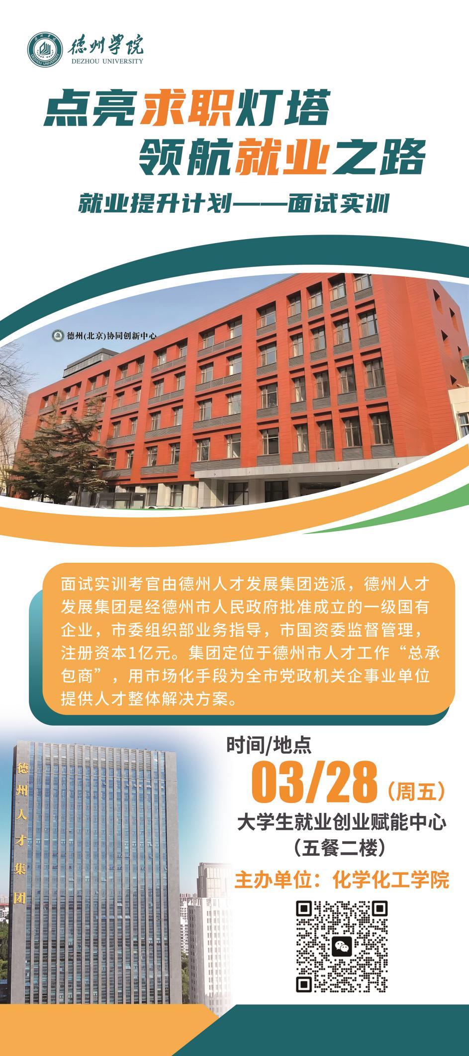 为切实提升毕业生就业竞争力,掌握求职技巧,促进毕业生高质量就业,3月28日,化学化工学院于大学生就业创业赋能中心开展“‘青化学+’职面未来:就业能力提升特训营”面试实训活动。活动邀请德州人才集团的5位专家作为就业提升计划讲师及面试实训考官。