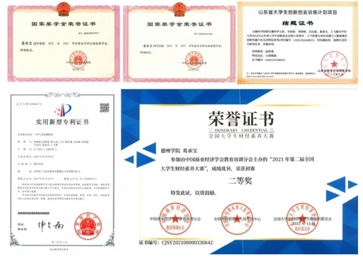 连续两学年学业成绩与综测成绩均位列专业第一名。曾获“2021-2022”学年国家奖学金、“2022-2023”学年国家奖学金、“2023-2024”学年国家奖学金、山东省优秀学生干部、山东省优秀学生、德州学院优秀大学生奖学金、综合一等奖学金、综合二等奖学金、十佳大学生、十佳学生干部、优秀学生干部、优秀共青团干部、三好学生等荣誉。