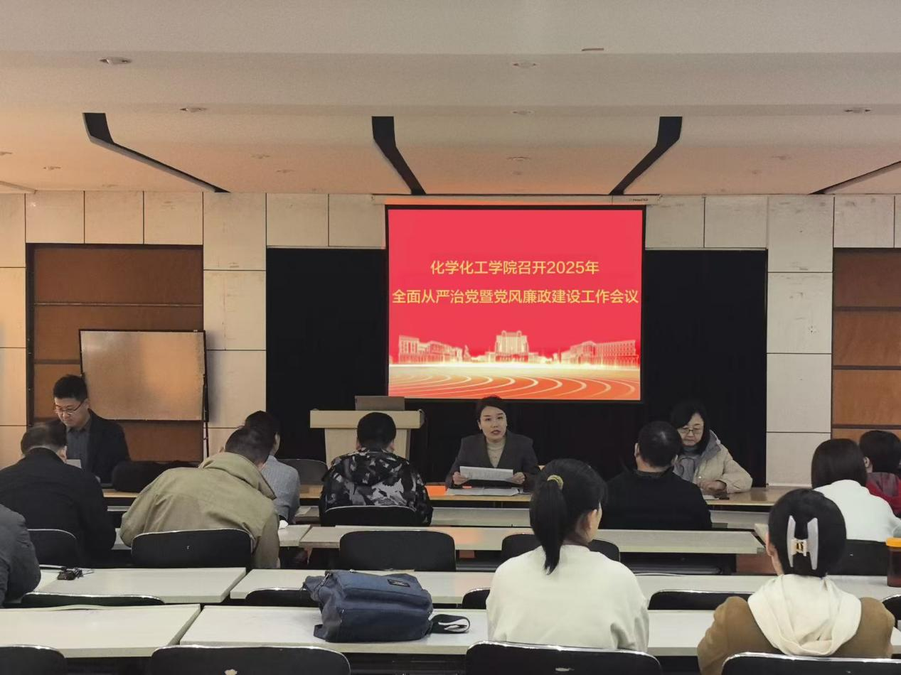 为贯彻落实学校2025年全面从严治党暨党风廉政建设工作会议精神,3月20日,化学化工学院召开2025年全面从严治党暨党风廉政建设工作会议。会议由院党委书记主持,党政领导班子、教职工参加。