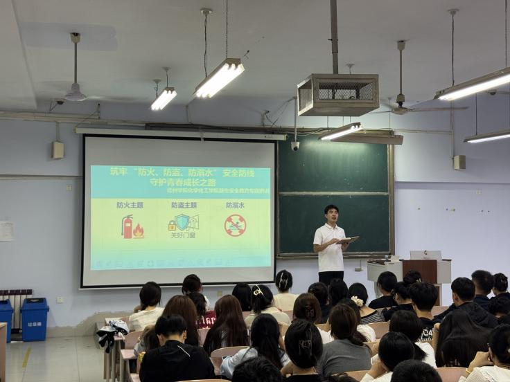 为切实提升学生的安全防范意识与自我保护能力,筑牢校园安全防线,化学化工学院召开以“筑牢‘防火、防盗、防溺水’安全防线,守护青春成长之路”为主题的安全教育讲座。此次活动由学院辅导员主讲,2025级全体新生参加。