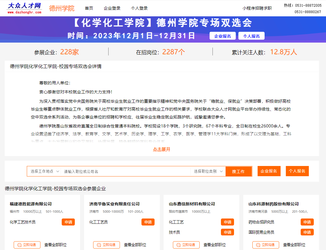 微信报名入口:手机微信扫码关注“大众人才网”微信公众号,企业和毕业生分别点击相关按钮进入德州学院专场,点击报名按钮,注册或登录已有账号即可直接参与。